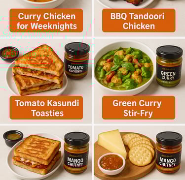 A vibrant grid-style blog graphic showcasing five everyday Perth meals elevated with Aromatic Kitchen’s small-batch pastes and chutneys, from quick curry chicken and BBQ tandoori to kasundi toasties, green curry stir-fries and mango chutney grazing boards. A clean, modern layout highlights each dish alongside the featured jar, capturing convenience, flavour, and the essence of home-cooked WA food culture.
